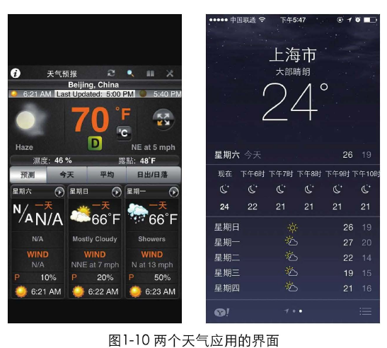 图1-10是2个应用的界面截图。同样是天气预报的应用,左边的界面元素复杂,内容杂乱,用户很难快速获取信息,而右边的界面就清晰很多了。如果设计师都能长期关注设计趋势、关注优秀的设计是什么样的,那左边这样的设计也许慢慢地就不复存在了。踩着巨人的肩膀,才能看得更远。